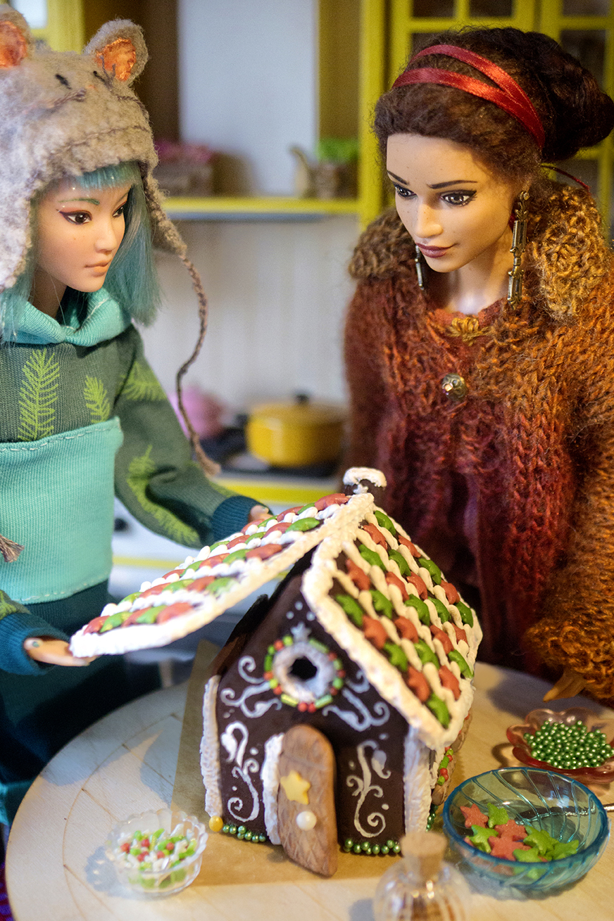 With selfmade Gingerbread house made of polymer clay and sugar pearls.